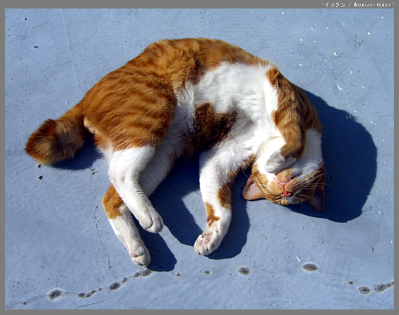 The cats are own pets. Ikkun's tail is curled up like a squirrel.